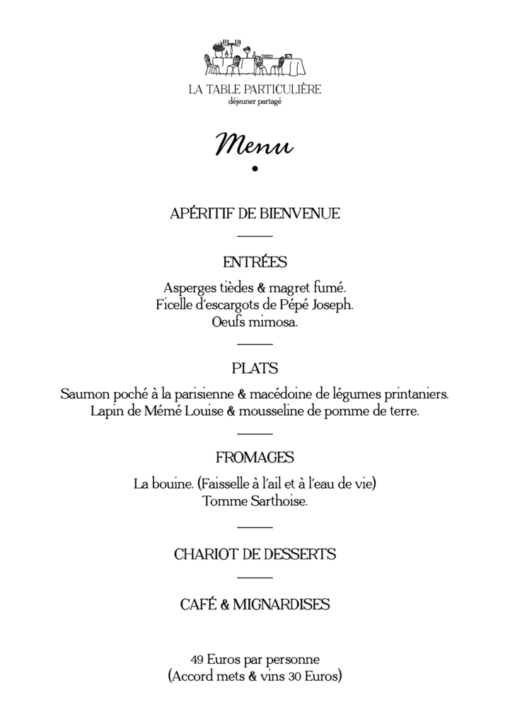 Dimanche 26 avril, venez partager en toute convivialité notre table particulière. Le chef propose un menu pensé comme un repas de famille. Places limitées.